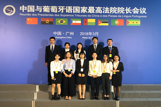 几内亚比绍代表团于3月22日最先抵粤,3月23日,原定陪同几内亚比绍代表团参访宝墨园的翻译临时有事,代表团翻译志愿者肖颖在22日晚临时接到翻译任务后抓紧时间准备,在23日当天圆满完成任务。3月24日,葡语志愿者罗子建与外交部一位高翻一道,承担在香格里拉大酒店夏宫红棉厅周强院长与各国代表团团长工作会谈并共进晚餐活动的翻译任务。3月26日,在各代表团游览珠江夜景过程中,郑晓妮同学担任游船VIP厅翻译。3月24日到3月27日,葡语志愿者霍慧琳为各国代表团参观广州海事法院这一重要活动作出了很大的努力,连续几天加班加点,翻译和校对海事法院内中葡双语标语和字幕。3月37日,中华人民共和国首席大法官,最高人民法院院长周强为表达对18位葡语志愿者在本次会议所作出的努力的感谢,在参观完广州海事法院后,与各志愿者一一亲切握手。18名学生在各代表团从抵粤到离粤期间,认真工作,不辞辛苦,圆满完成了接待工作,得到了最高人民法院,广东省高级人民法院的有关领导和外方代表团的高度评价。
