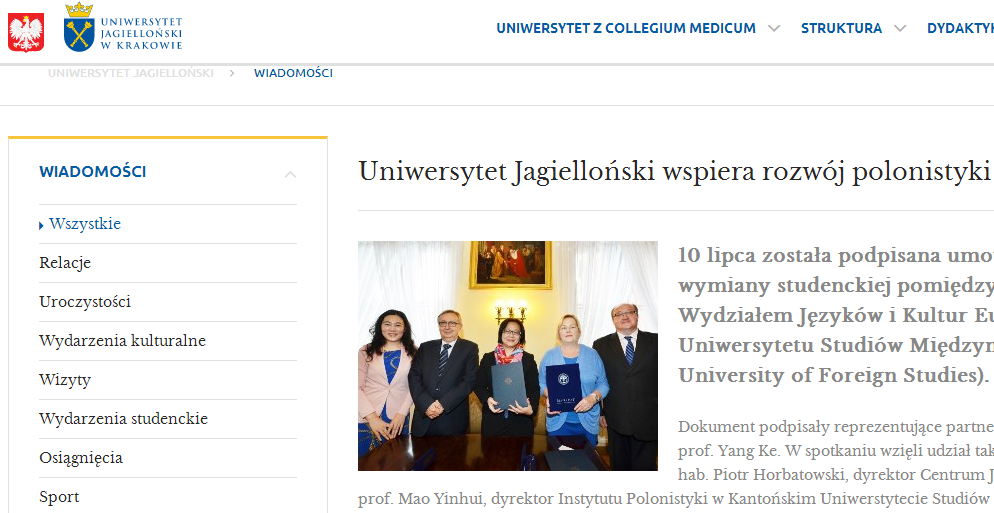2014年12月8日雅大波兰语言文学院院长莱娜塔·普日贝尔斯卡(RenataPrzybylska)女士和对外波兰语言文化中心主任彼得·豪尔巴托夫斯基(PiotrHorbatowski)先生曾访问我校。期间双方就两校合作的相关事宜进行了广泛协商,体育平台