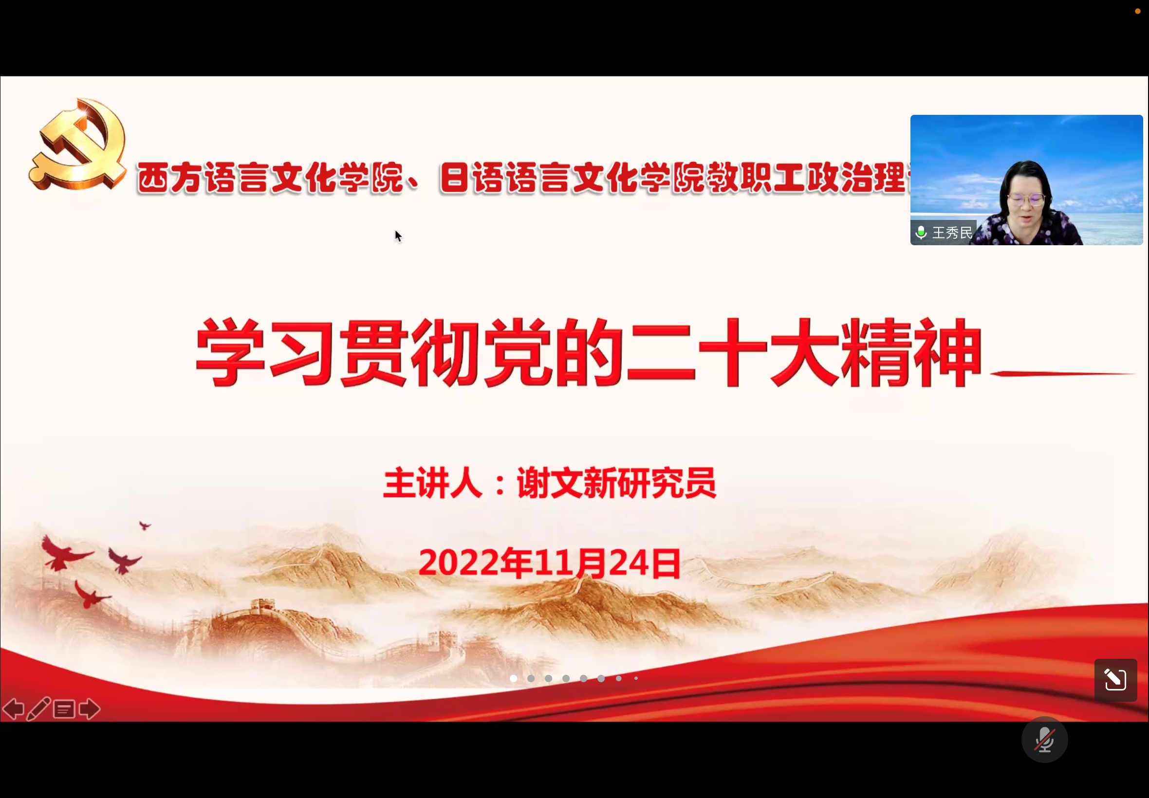 谢文新研究员的辅导报告分为“深学党的二十大精神、细悟党的二十大报告内涵、贯彻落实党的二十大精神,推动学校各项事业高质量发展”三个部分。谢文新研究员从五个方面解读了党的二十大报告,分析了党的二十大报告的重点,并讲解了党的二十大精神对党和国家事业的新部署新要求。他指出,只有全面、系统、深入地学习,才能够完全、准确地领略党的二十大精神,为下一步的工作打下坚实的基础。