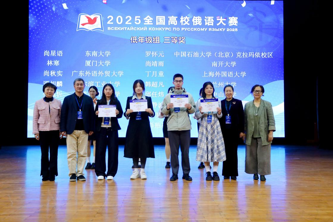 俄语系学子凭借扎实的专业功底与出色的综合素养,在比赛中表现优异。其中,2024级本科生尚秋实同学荣获低年级组三等奖,2025级硕士研究生王建楠同学荣获研究生组三等奖;2022级本科生丁梓晟与2025级硕士研究生陈姿颖分获高年级组和研究生组优秀奖。俄语系教师石树、陈欢以及外教扎利·沙拉夫特季诺夫获“优秀指导教师”称号。